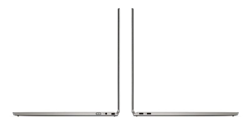 Left-side view of Lenovo ThinkPad Titanium Yoga laptop open on a counter, with a man’s right hand on keyboard.