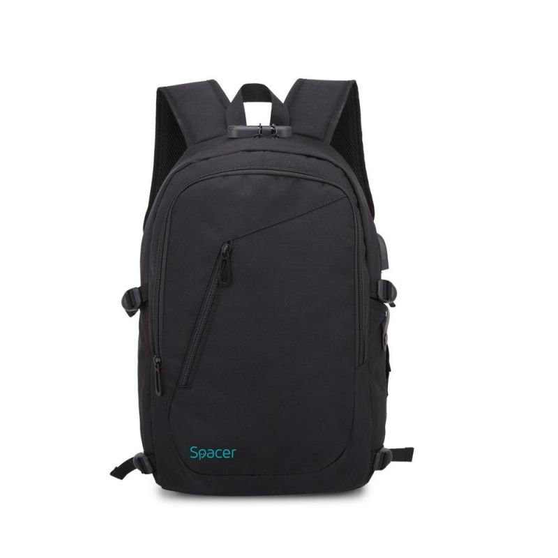 Rucsac Spacer SPB-DUKE pt. notebook de max. 15.6", 2 compartimente, buzunar frontal, buzunar lateral x 2, blocare fermoar, USB 2.0 (M)(pt. acces la Power Bank), Jack 3.5 mm (pt. acces la casti), waterproof, poliester, negru