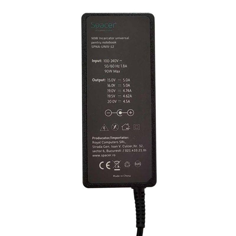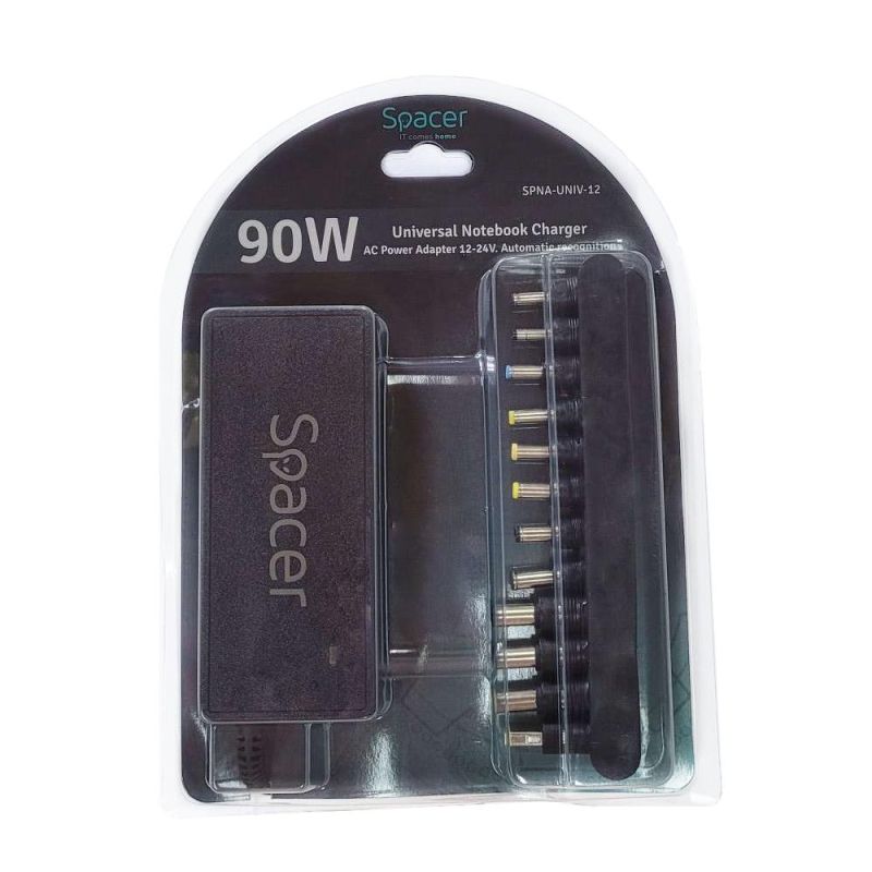 Incarcator laptop universal Spacer, 90W comutare automata tensiune – compatibil cu majoritatea NB, 12 tipuri de mufe, DC15/16/19/19.5/20V