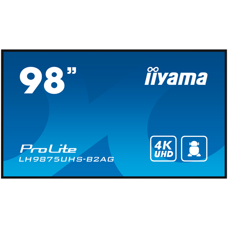 IIYAMA LFD LH9875UHS-B2AG 98" 4K UHD Professional Digital Signage display featuring Android OS, iiSignage² and OPS PC slot landscape, portrait Android 11 OS, iiSignage², FailOver, EShare
