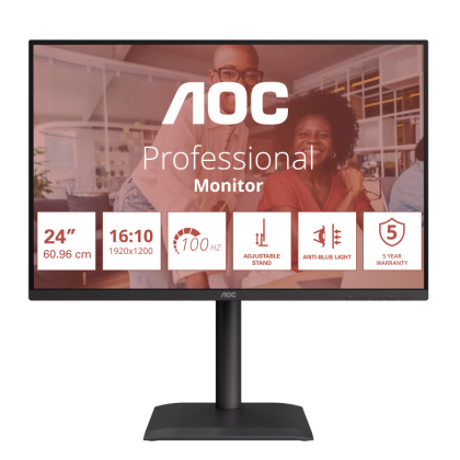 Monitor AOC 24" X24E4U, Diagonal (inch): 24, Diagonal (cm): 60, Aspect ratio: 16:10, Panel: IPS, Resolution: 1920x1200, Refresh Rate: 100Hz, Response time GtG: 4ms, Brightness (max): 300 cd/m², Contrast (static) : 1500:1, Contrast (dynamic): 20M:1, Viewing angle: 178/178, Color Gamut Type: sRGB, Color Gamut Coverage: 1.178, Colours: 16.7M, Speakers: 2Wx2, VESA Wallmount: 100x100, Tilt: -5/+30, HAS: 150mm, Pivot: +/-90°, Swivel: -180/+180, D-SUB: x1, HDMI: x1, DisplayPort: x1, USB Hub: 4x USB 3.1 Gen 1 Type-A (Downstream), 1x USB Gen 3.1 Type-B (Upstream), AUX: x1 3.5mm Audio OUT / x1 3.5mm Audio IN